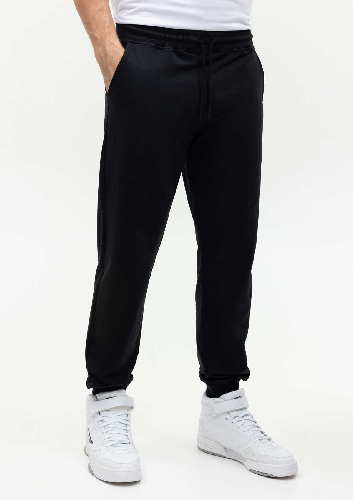 Мужские брюки свободного силуэта с эластичным поясом и прорезным карманом. Широкий пояс со шнурком в тон основному цвету обеспечивает удобную посадку на талии.