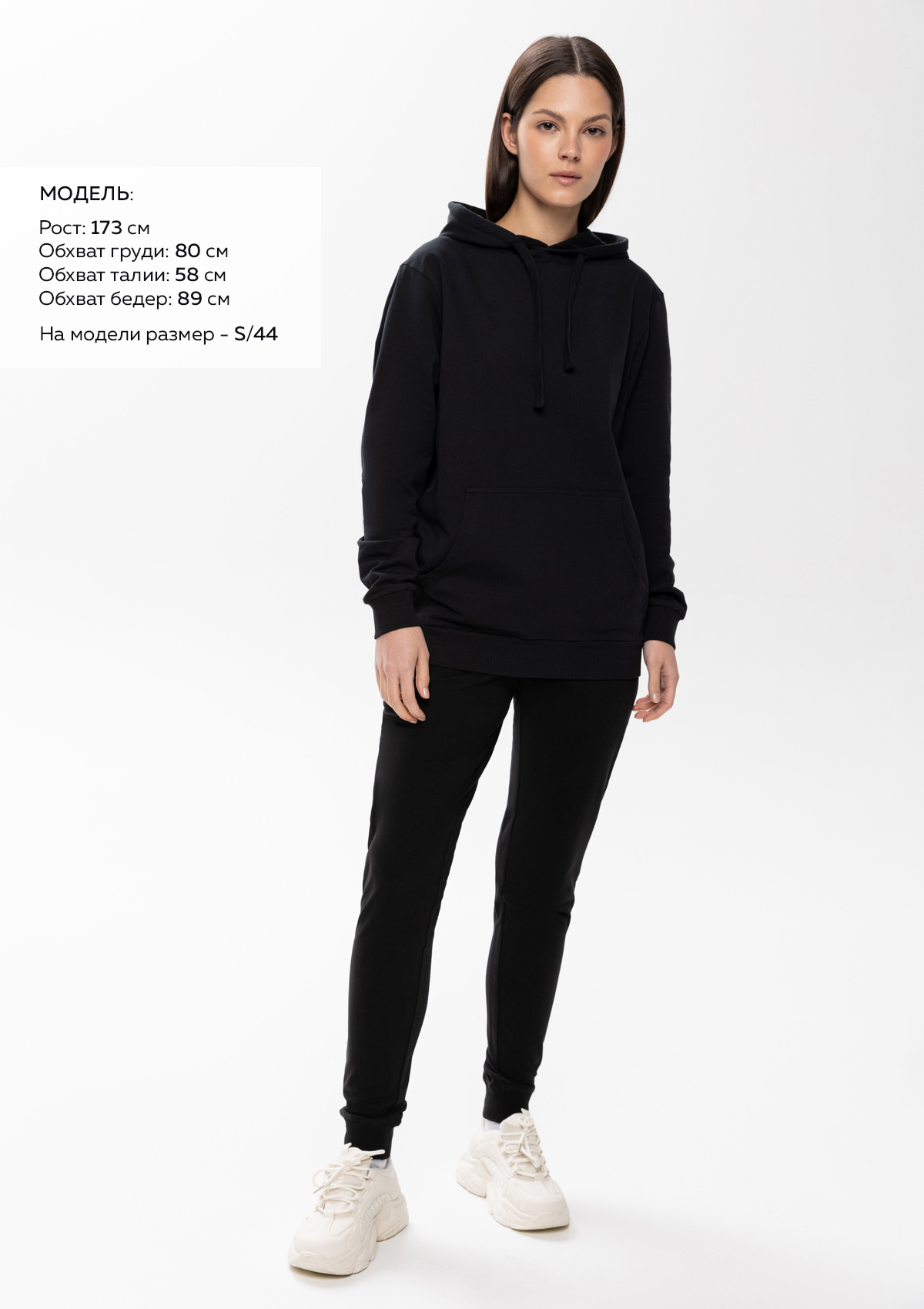 Размер женских брюк: S/44. Параметры модели: рост 173 см.; обхват груди 80 см.; обхват талии 58 см.; обхват бедер 89 см.