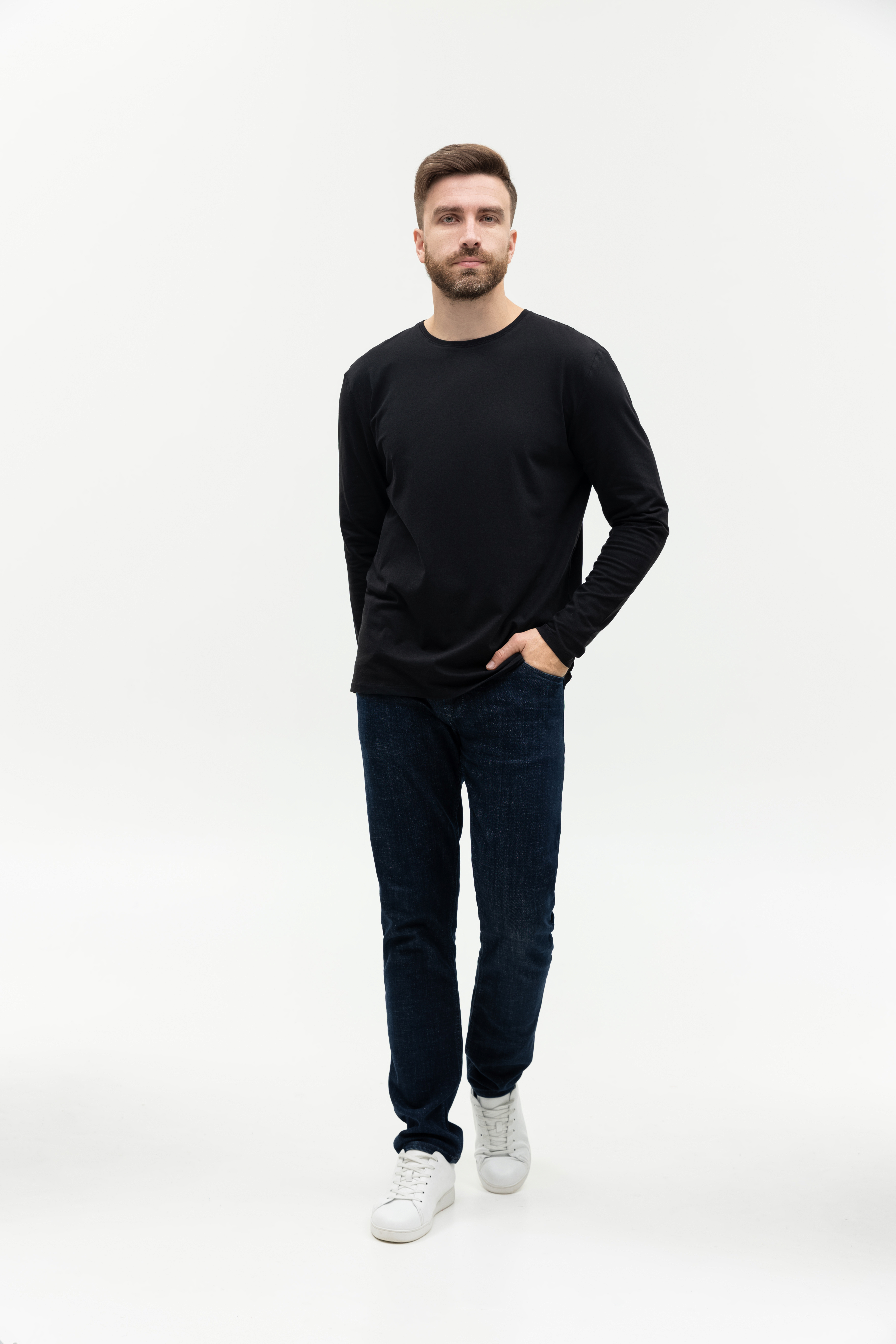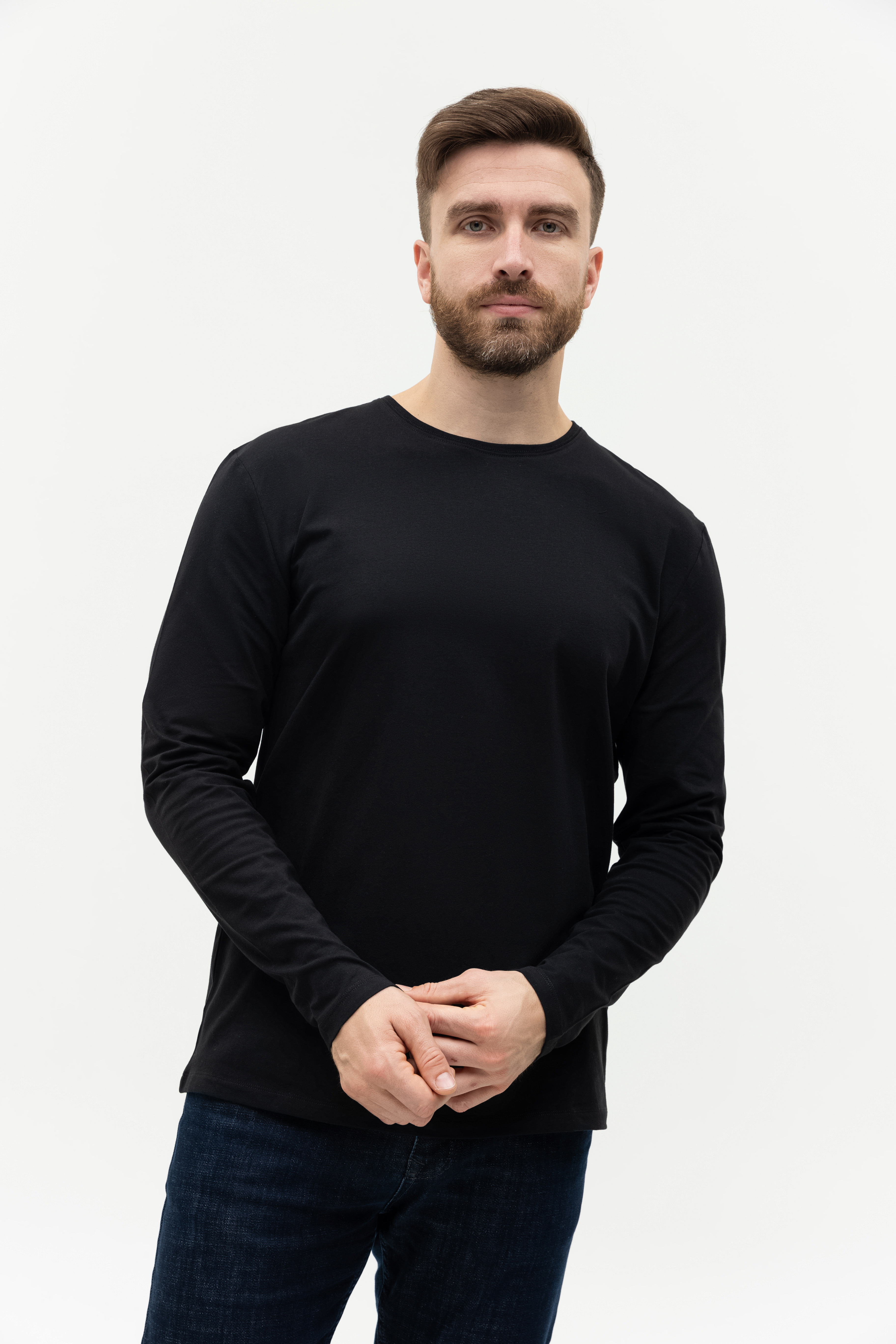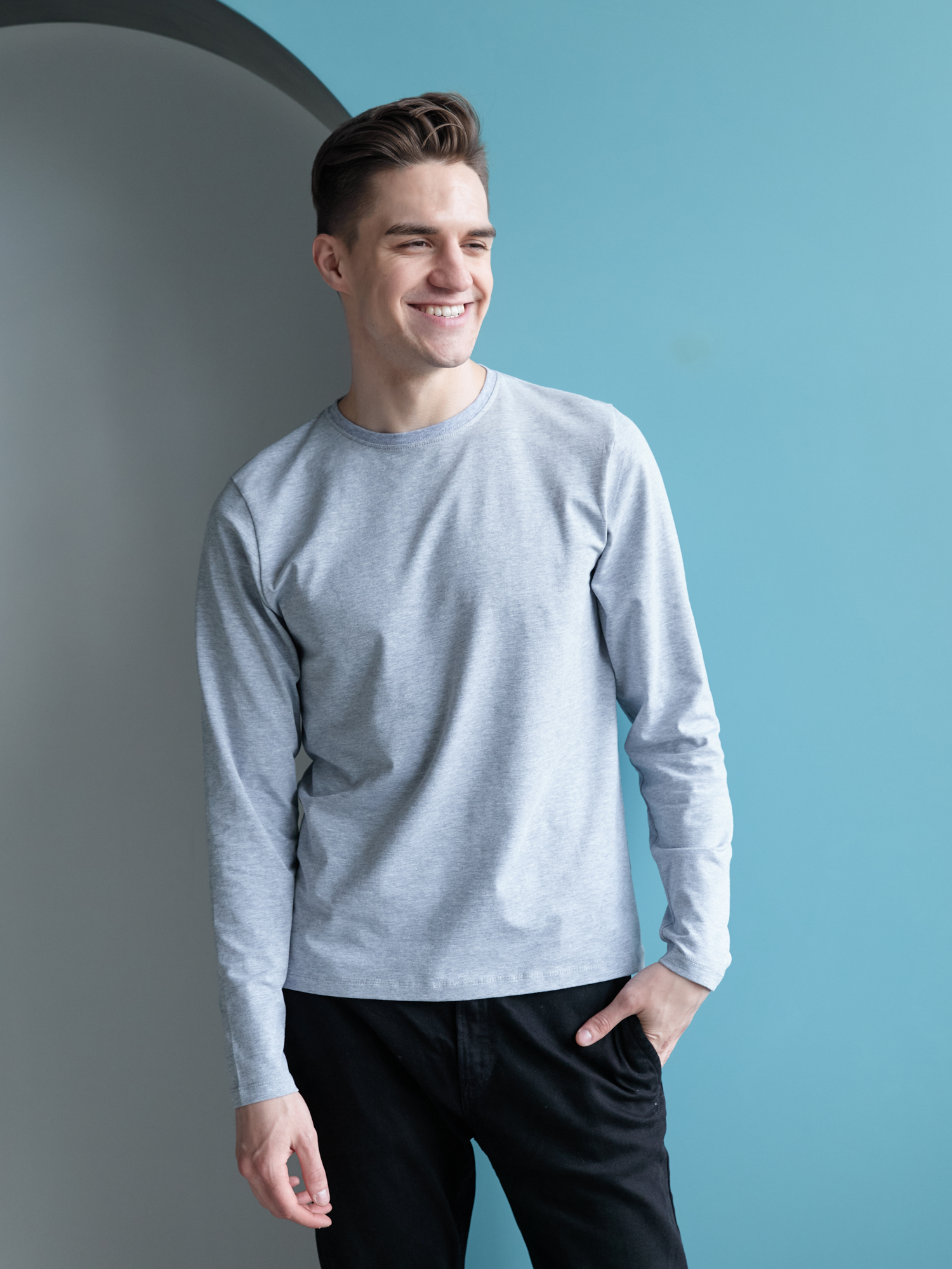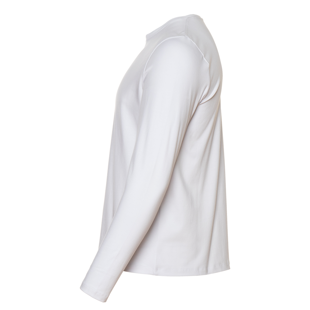 Универсальная футболка прямого силуэта с округлым воротом и длинным втачным рукавом. Плечевые швы и шов горловины усилены настрочной бейкой из основного полотна.
