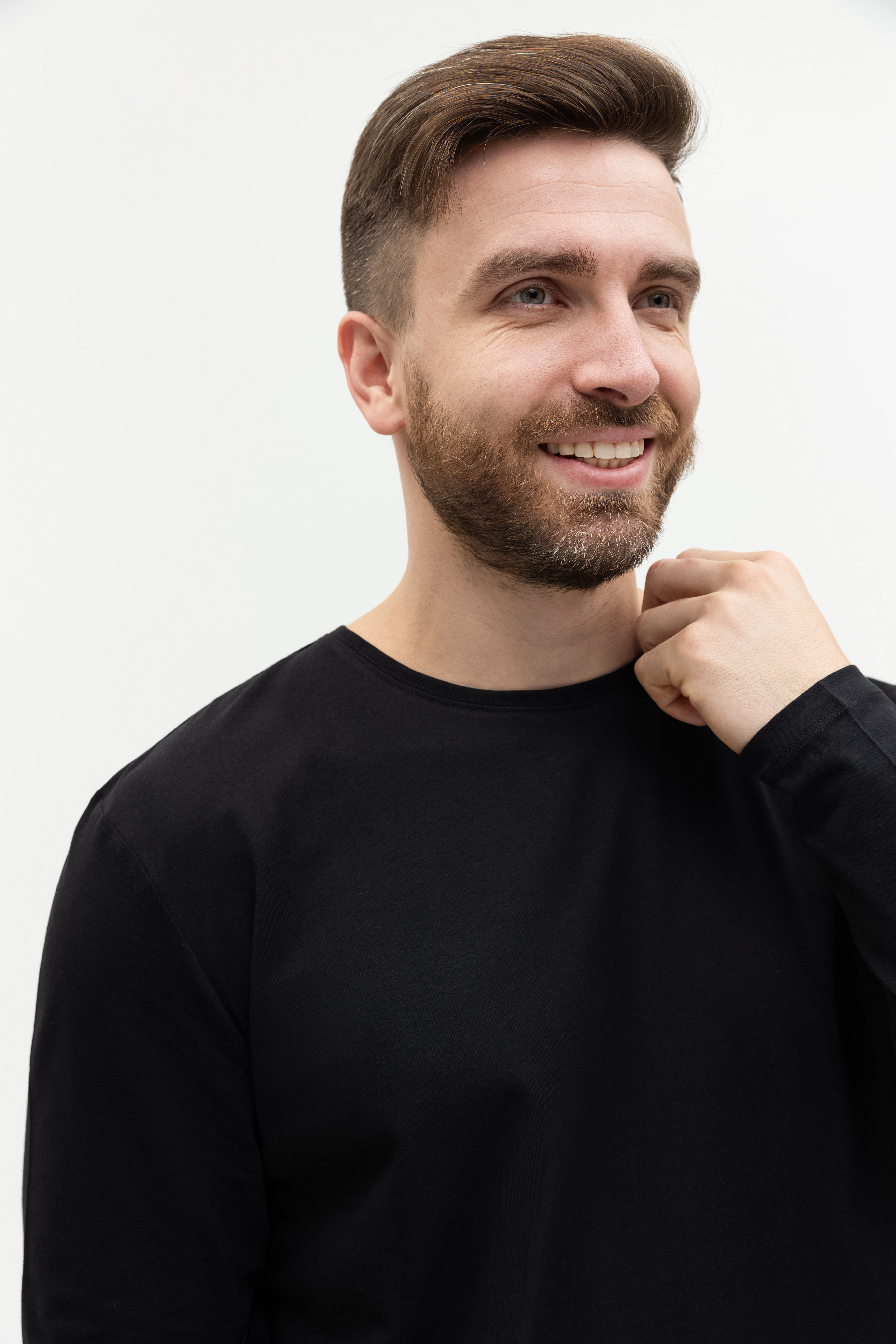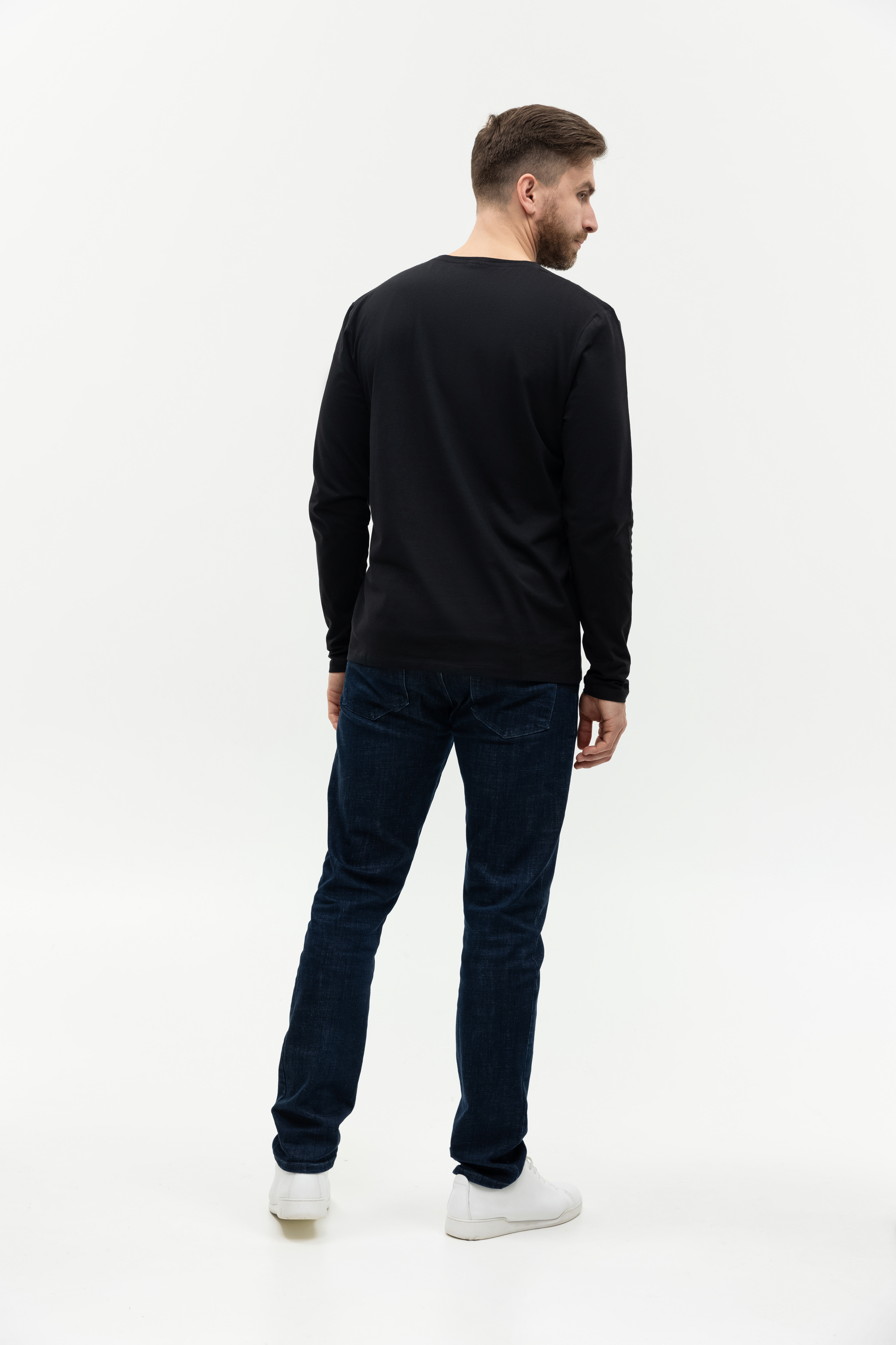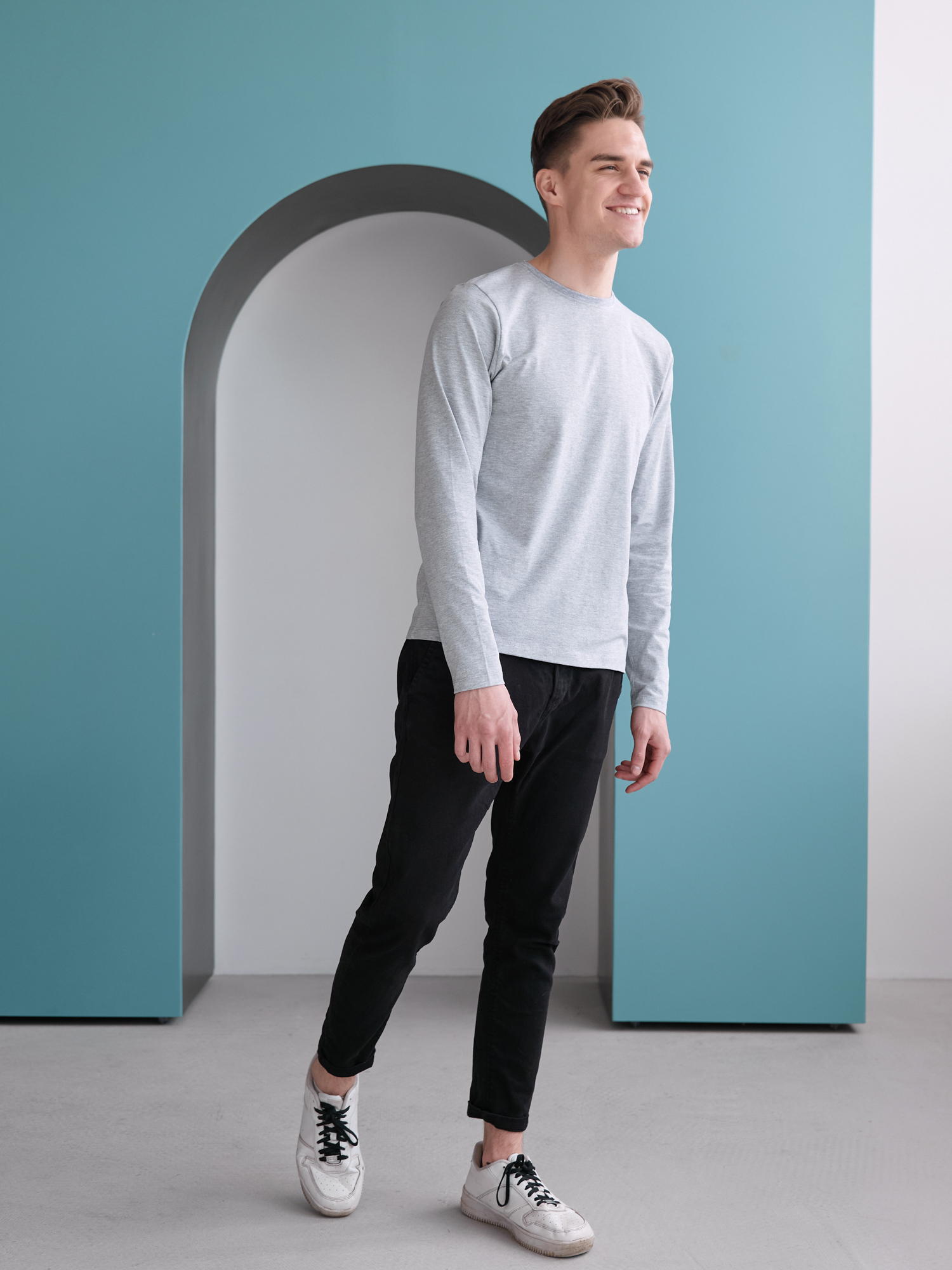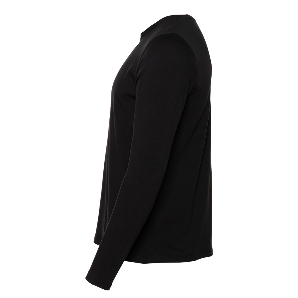 Универсальная футболка прямого силуэта с округлым воротом и длинным втачным рукавом. Плечевые швы и шов горловины усилены настрочной бейкой из основного полотна.