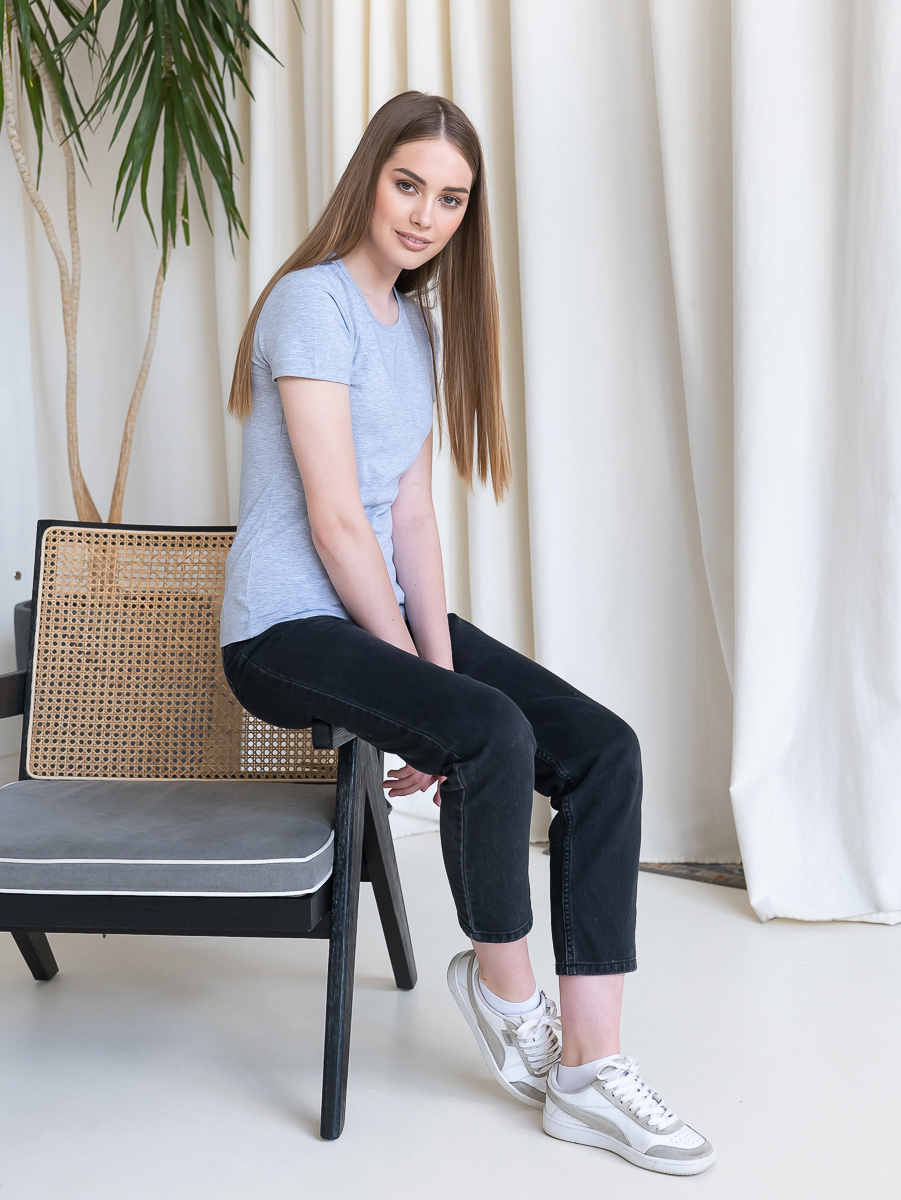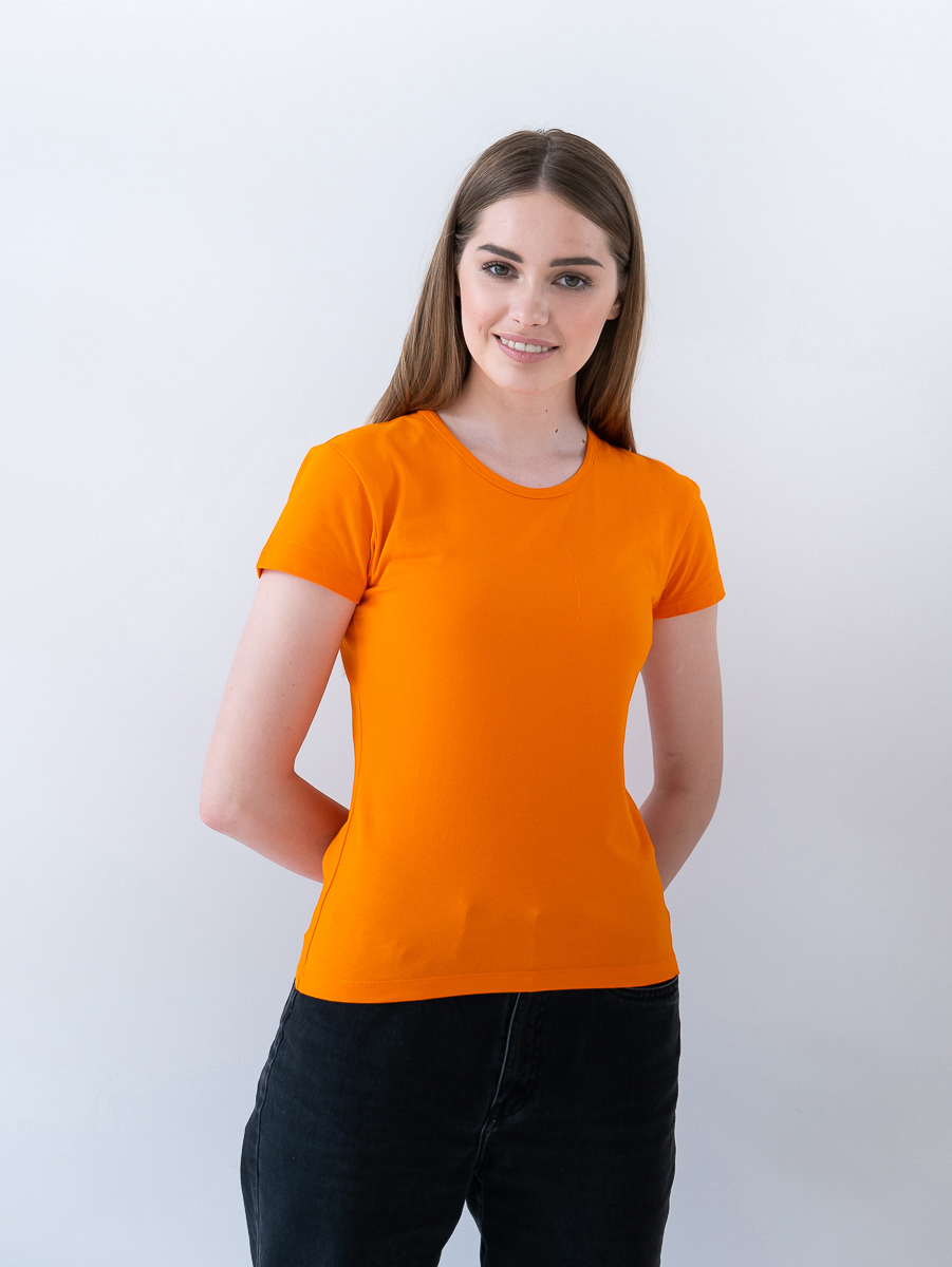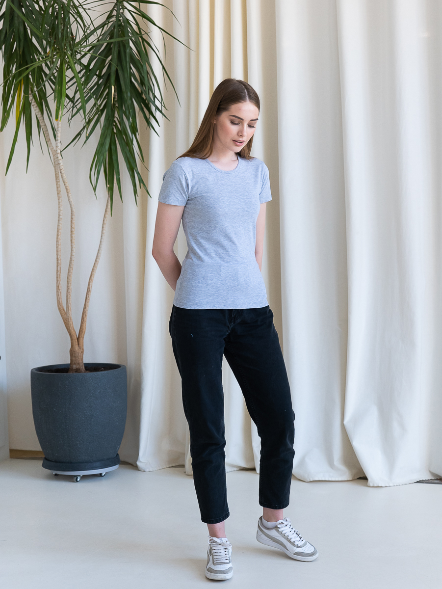 Женская футболка приталенного кроя с округлым врезом и втачным рукавом.