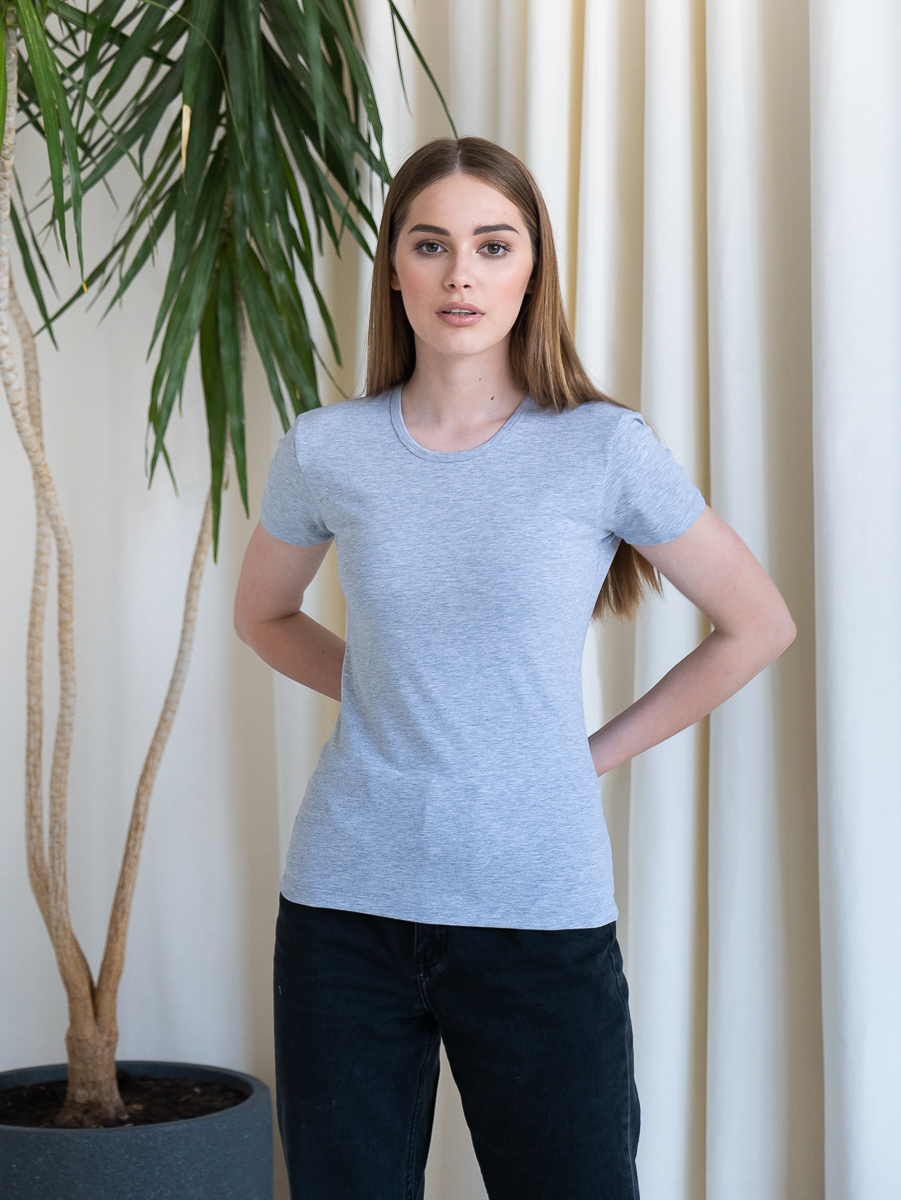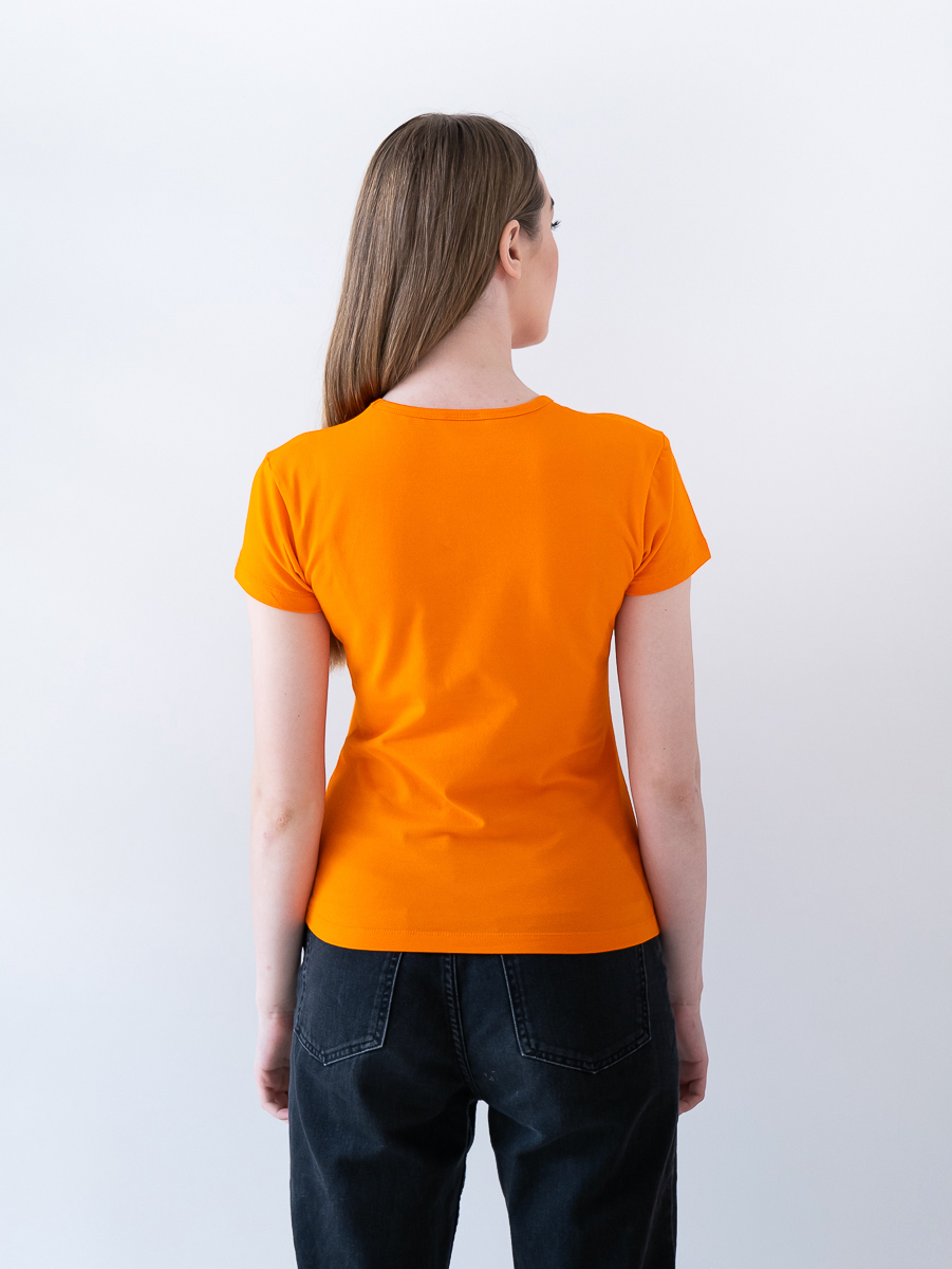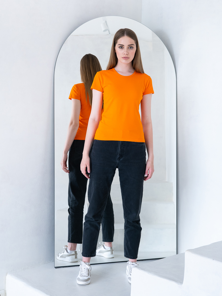 Женская футболка приталенного кроя с округлым врезом и втачным рукавом.