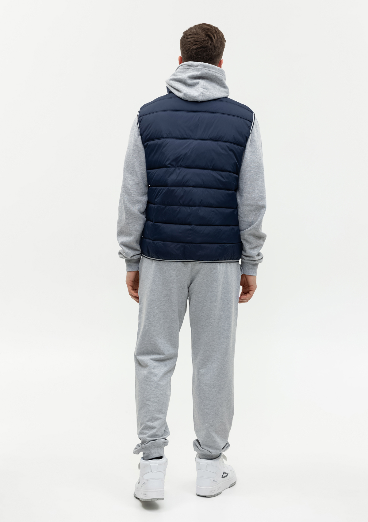 Мужской жилет прямого силуэта с геометричной стежкой, воротником-стойкой, прорезным карманом и застежкой на молнию. Изделие дополнено контрастной резинкой по пройме и линии низа для дополнительной защиты от холода и ветра.