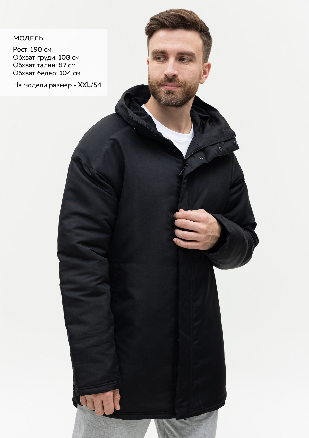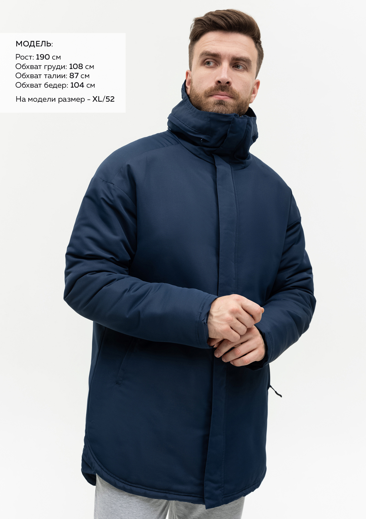 Размер на модели: XL/52. Параметры модели: рост 190 см.; обхват груди 108 см.; обхват талии 87 см.; обхват бедер 104 см.