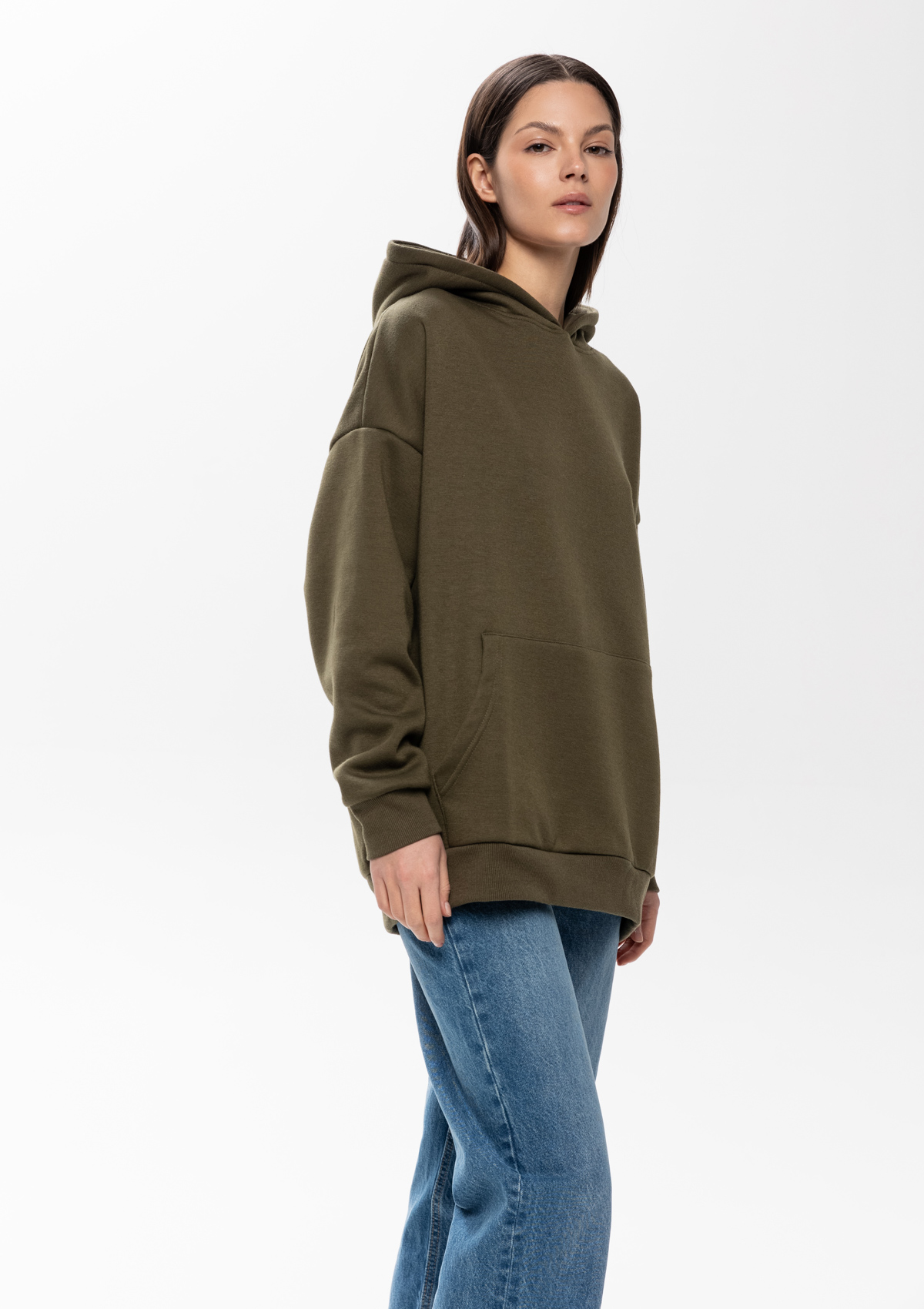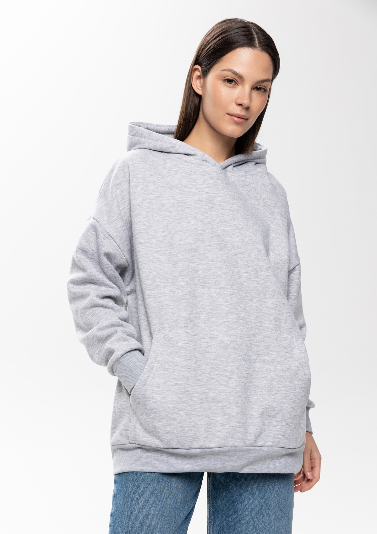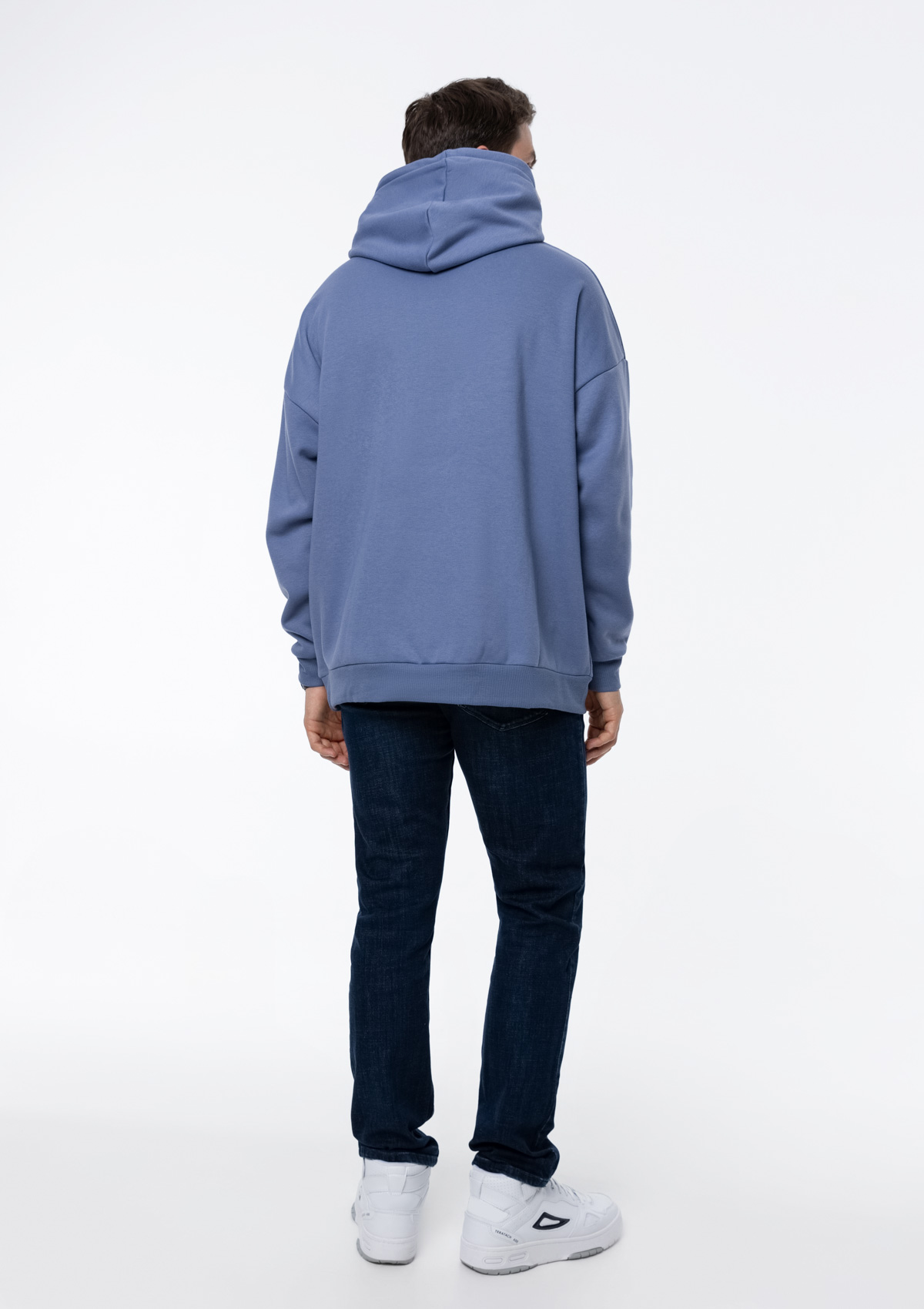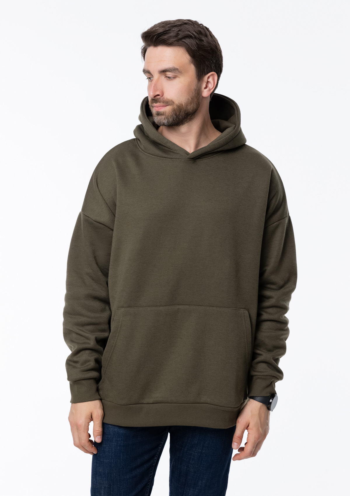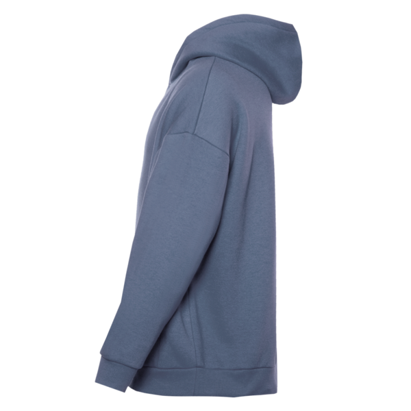 Толстовка свободного силуэта с капюшоном комфортной глубины, спущенной линией плеча и глубоким карманом-кенгуру. Манжет и низ изделия оформлены широкой эластичной резинкой в тон основному цвету.