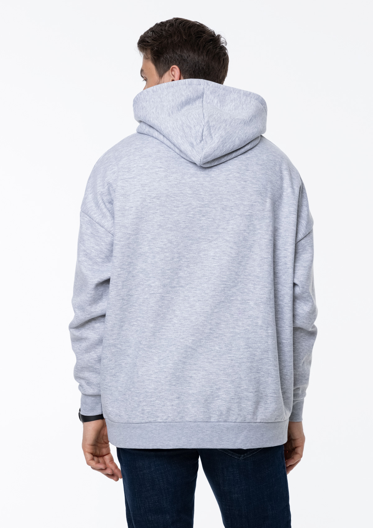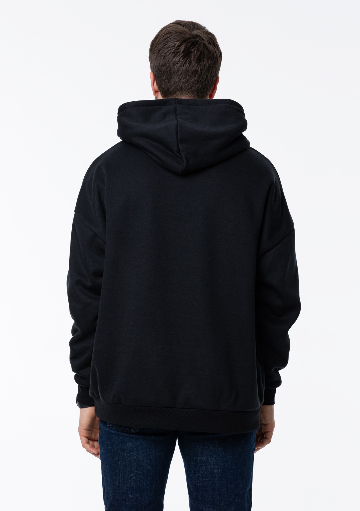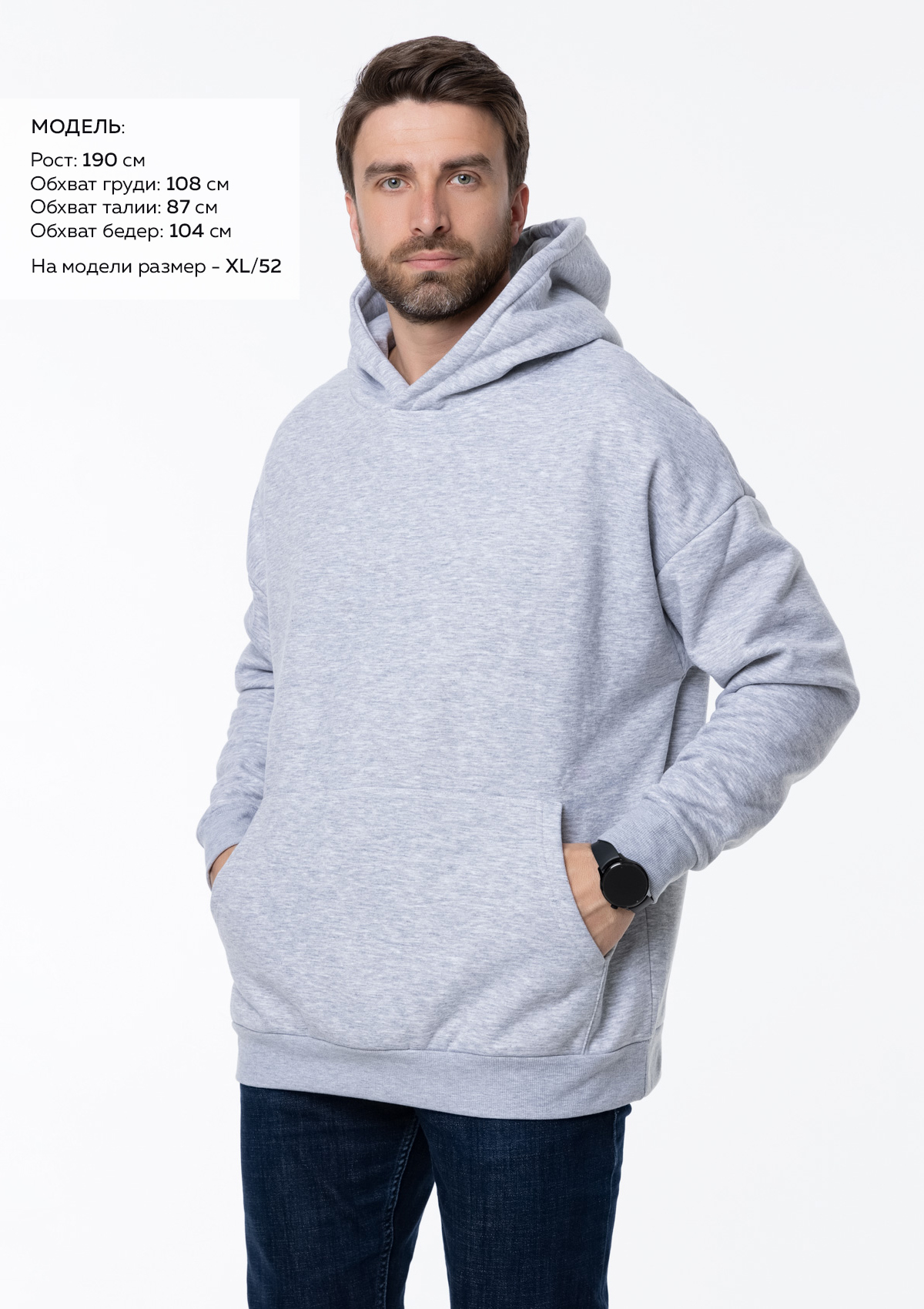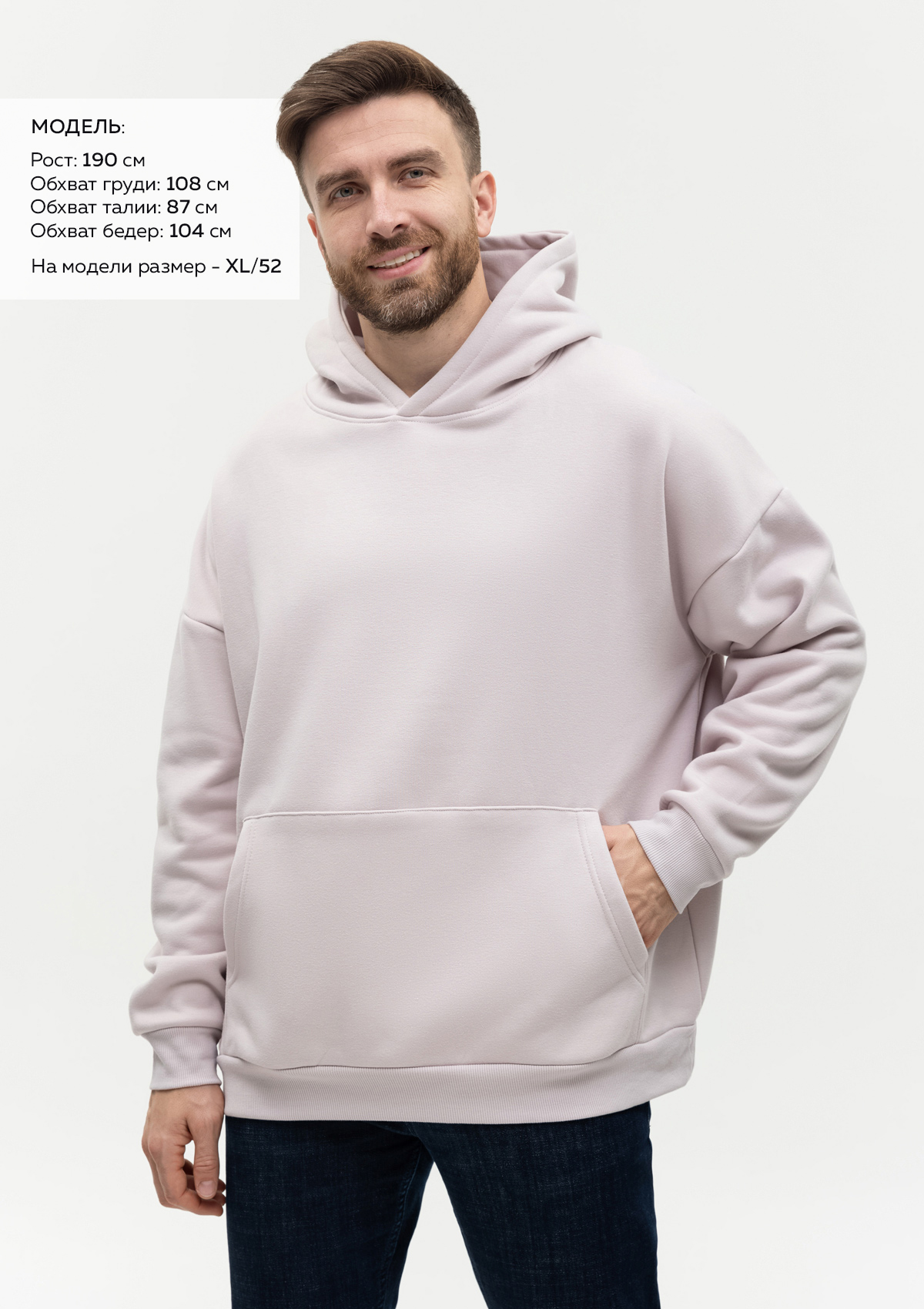 Размер мужского худи: XL/52. Параметры модели: рост 190 см.; обхват груди 108 см.; обхват талии 87 см.; обхват бедер 104 см.