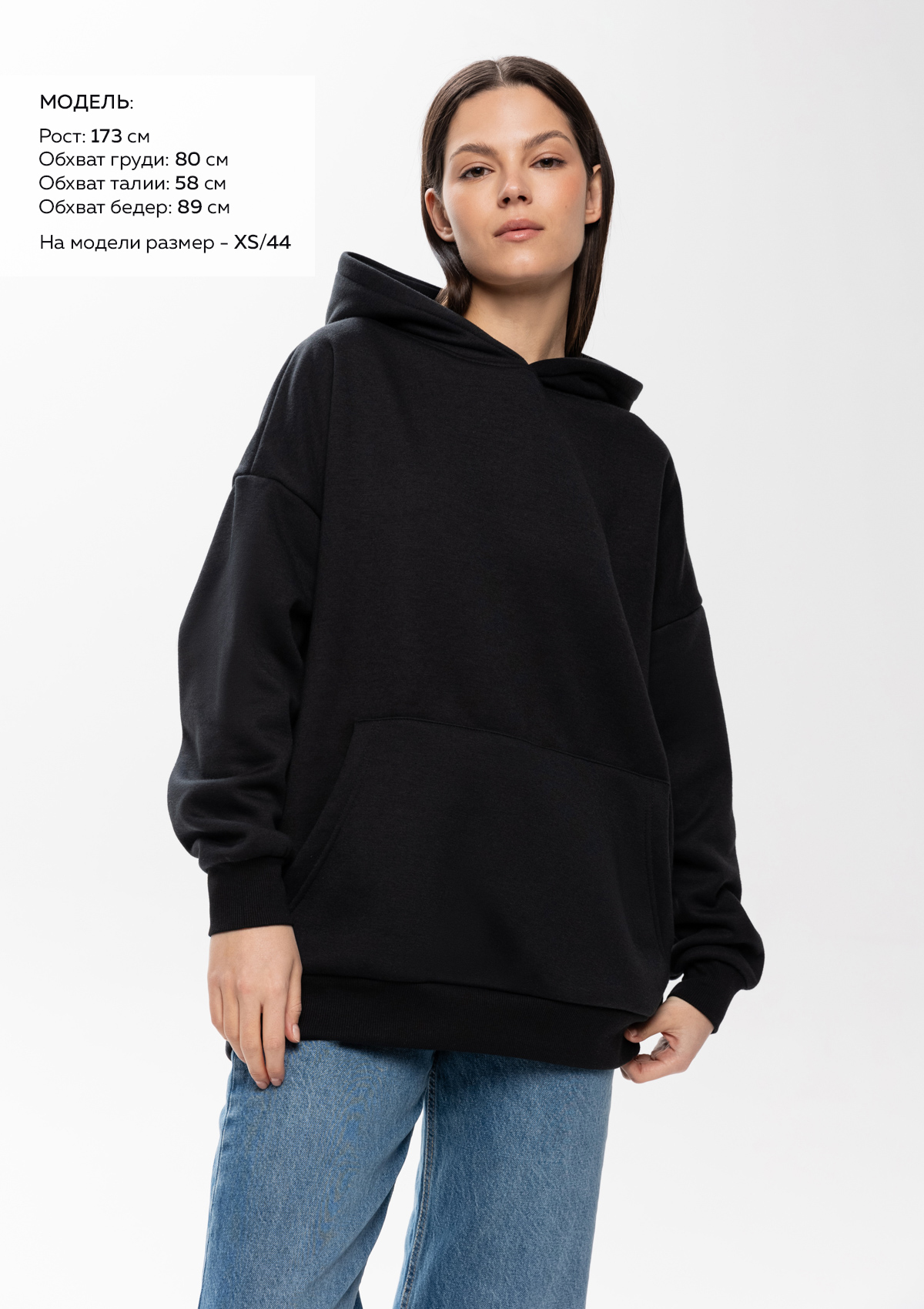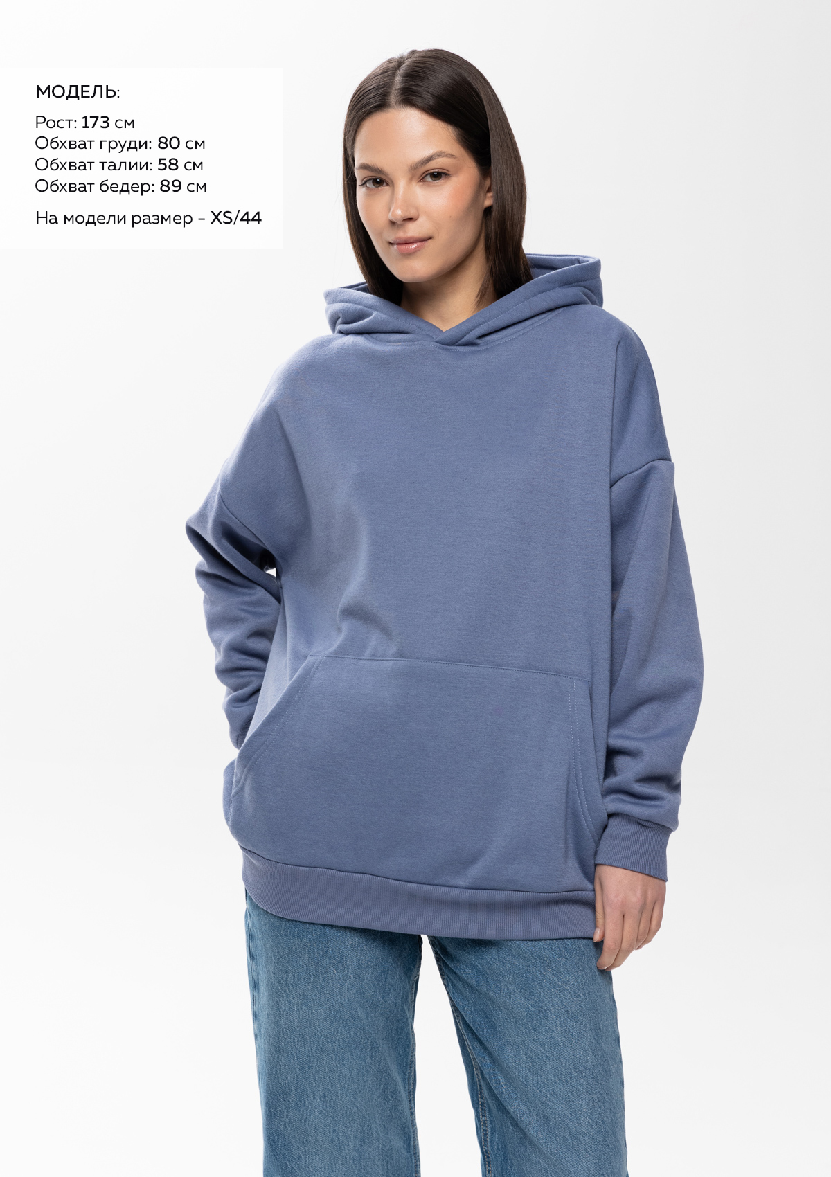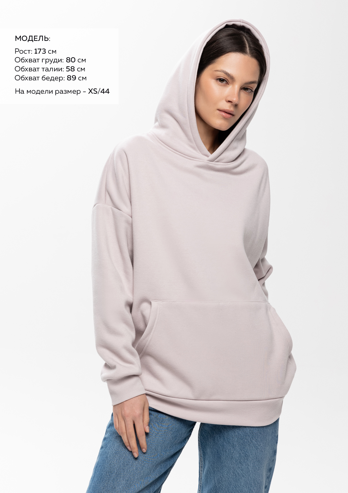 Размер женского худи: XS/44. Параметры модели: рост 173 см.; обхват груди 80 см.; обхват талии 58 см.; обхват бедер 89 см.