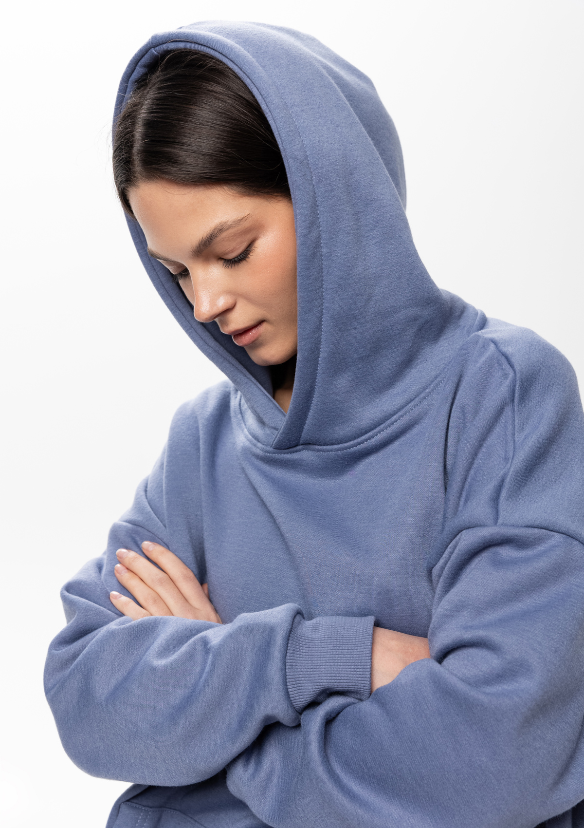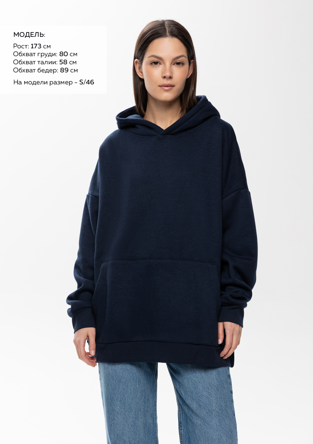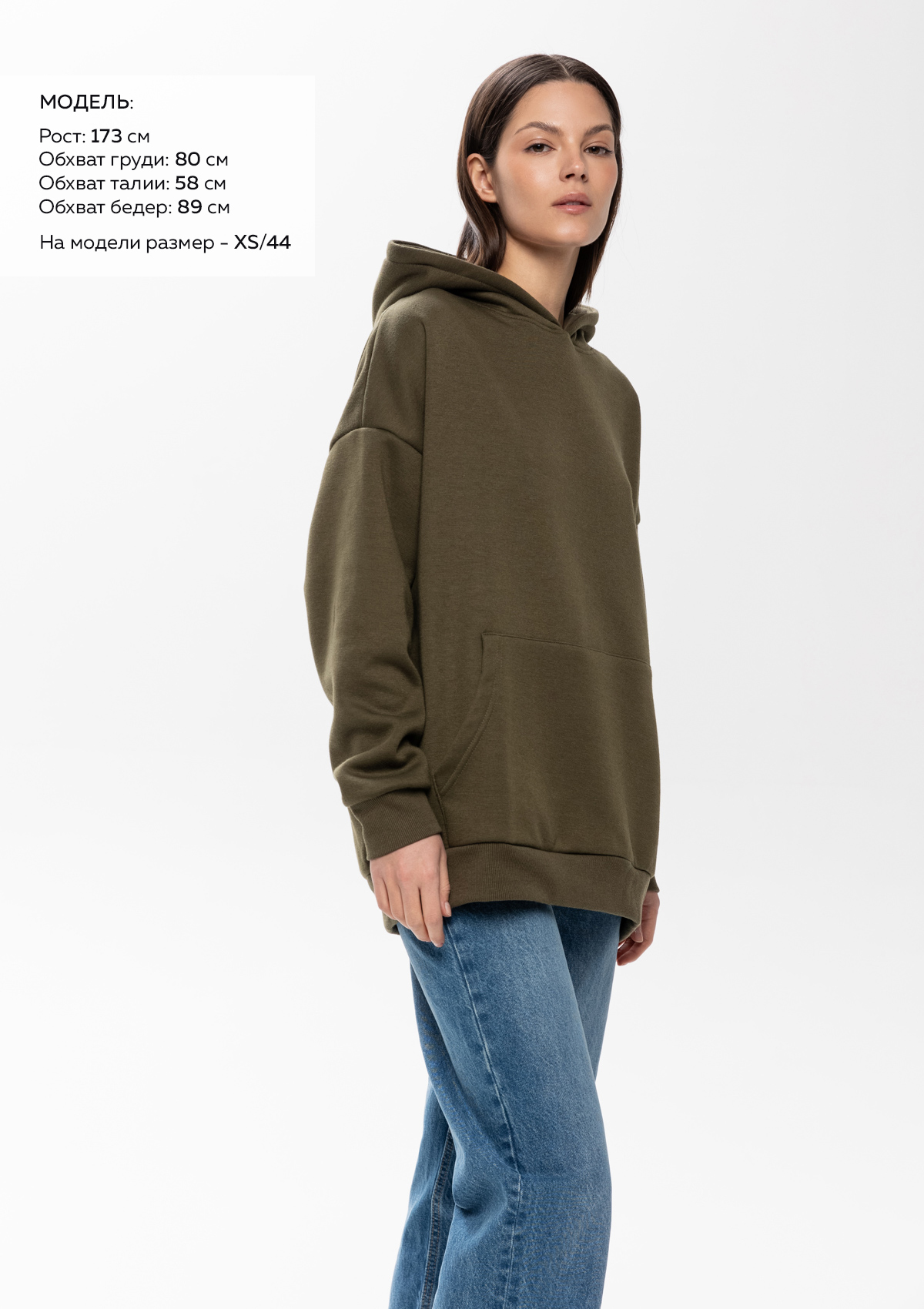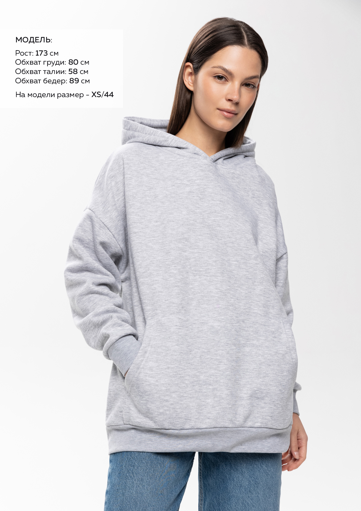 Размер женского худи: XS/44. Параметры модели: рост 173 см.; обхват груди 80 см.; обхват талии 58 см.; обхват бедер 89 см.