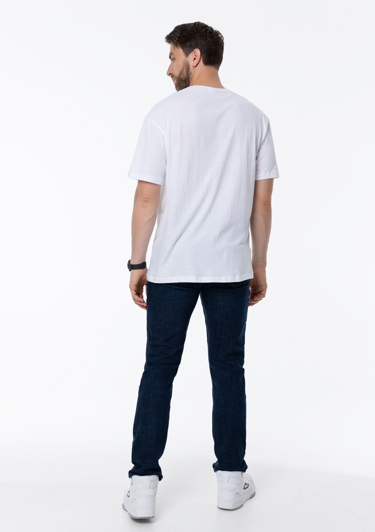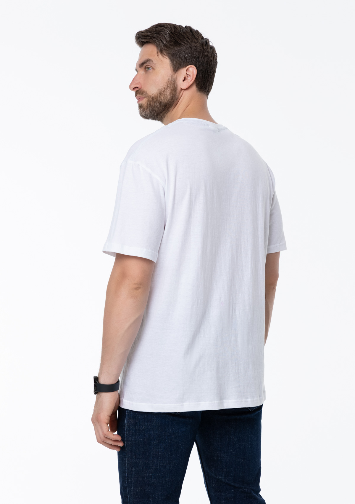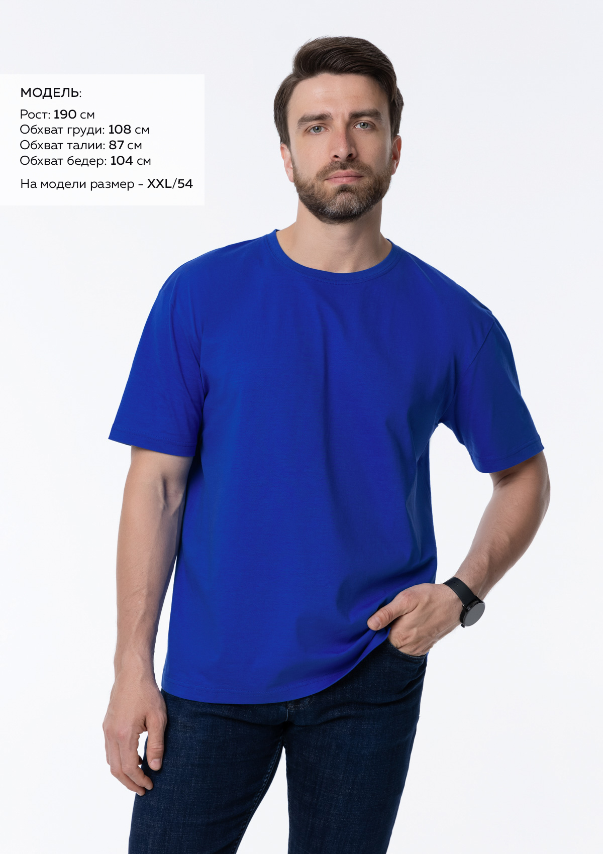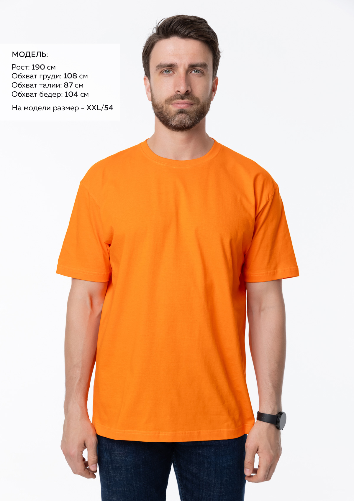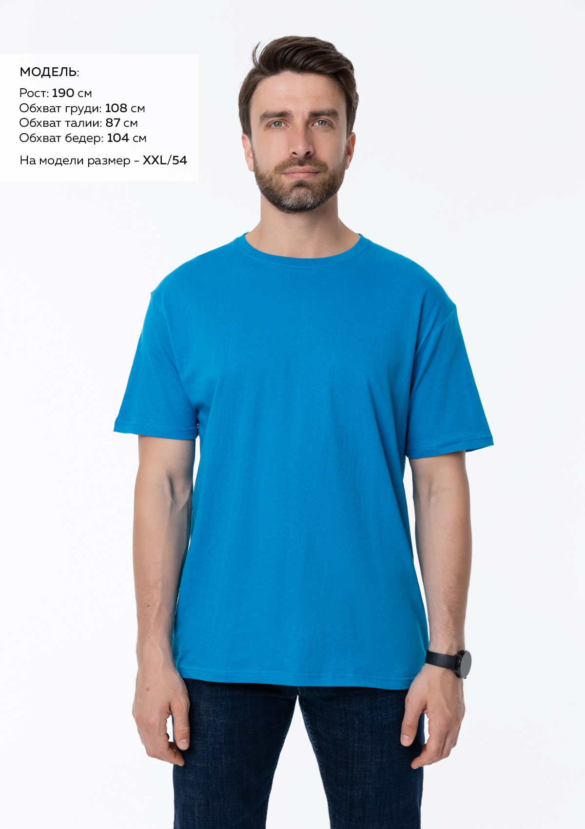 Размер мужской футболки: XXXL/56. Параметры модели: рост 190 см.; обхват груди 108 см.; обхват талии 87 см.; обхват бедер 104 см.