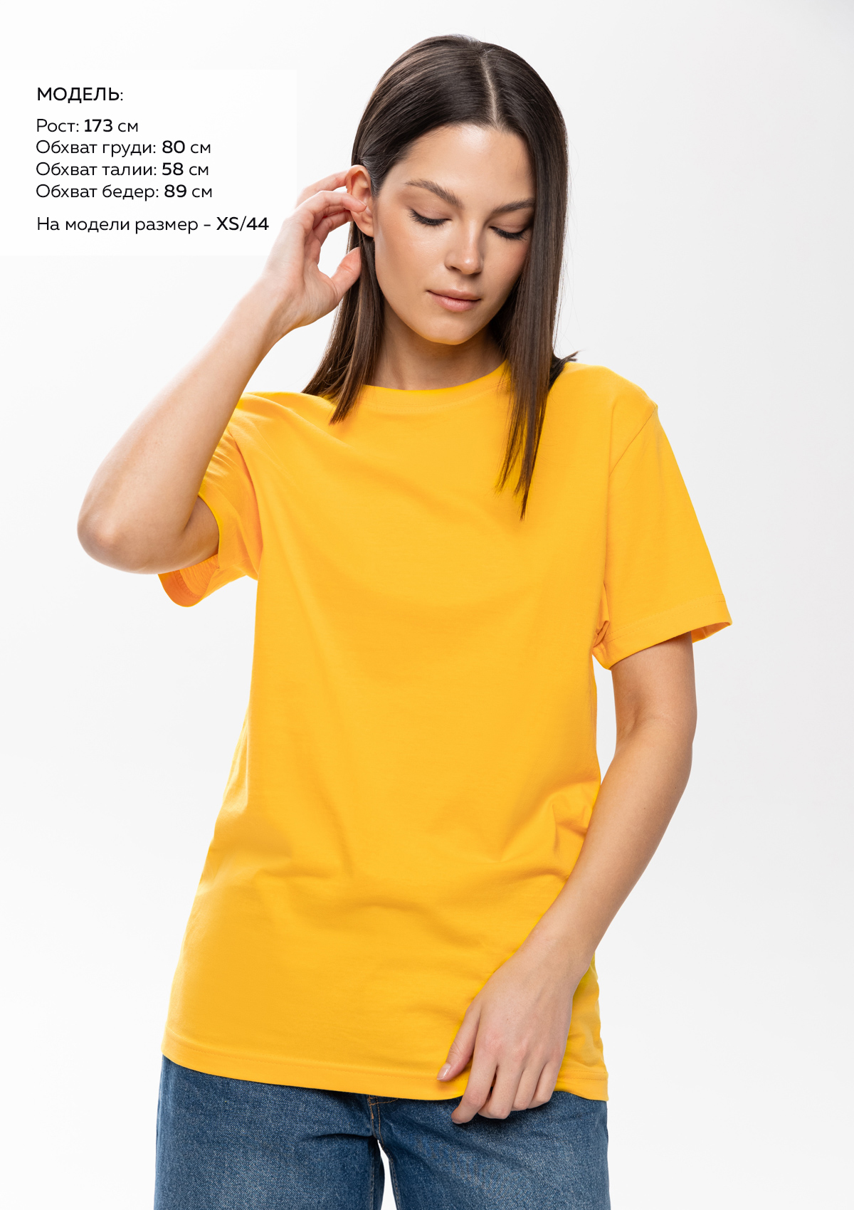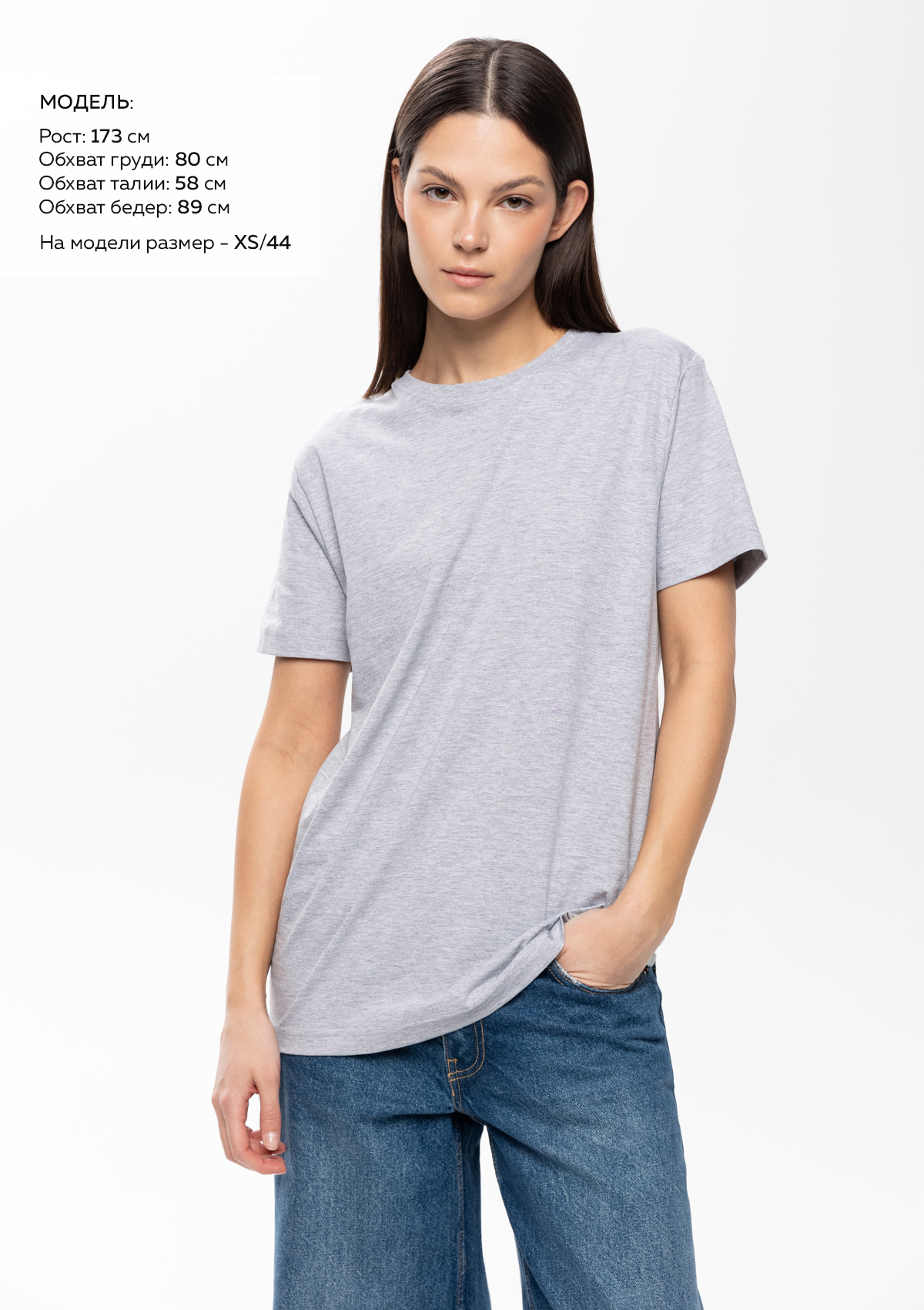 Размер женской футболки: XS/44. Параметры модели: рост 173 см.; обхват груди 80 см.; обхват талии 58 см.; обхват бедер 89 см.