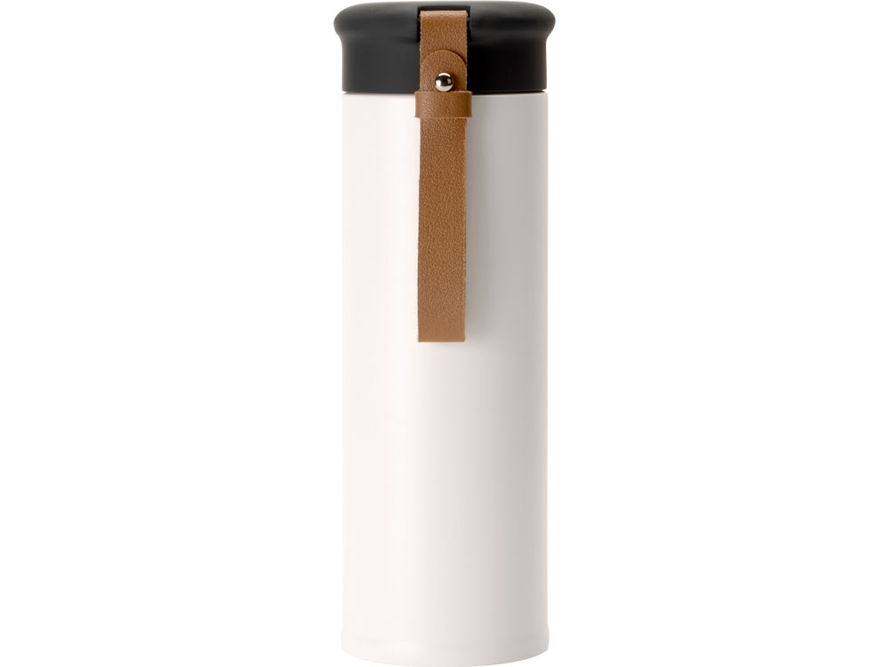 Термос герметично завинчивается на крышку, оснащенную съемным ремешком из качественной ПУ кожи. Крышка имеет прорезиненное покрытие, что создает интересное сочетание текстур в рамках одной модели. Корпус имеет элегантную рельефную поверхность с антискользящим эффектом.