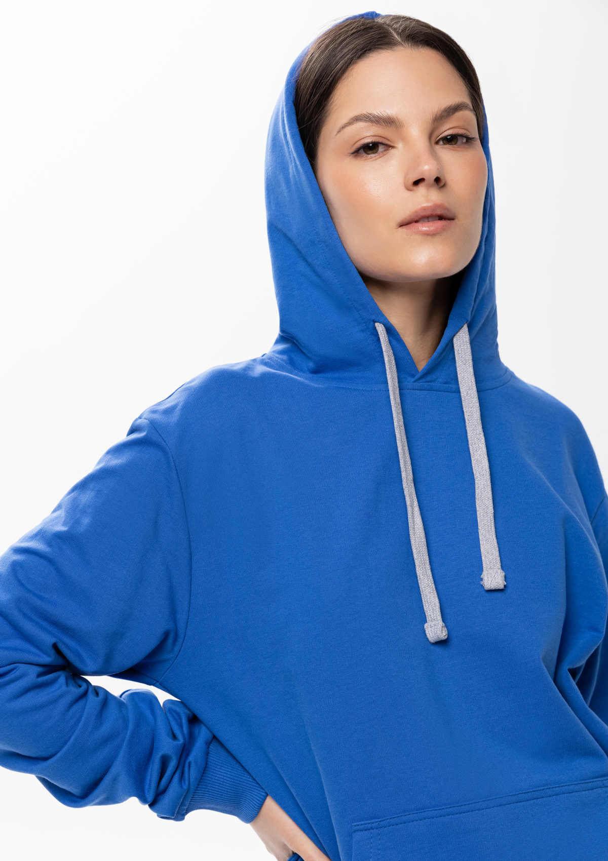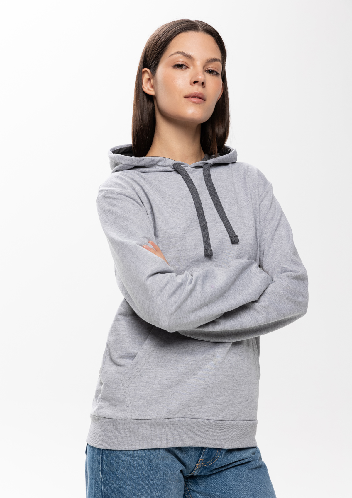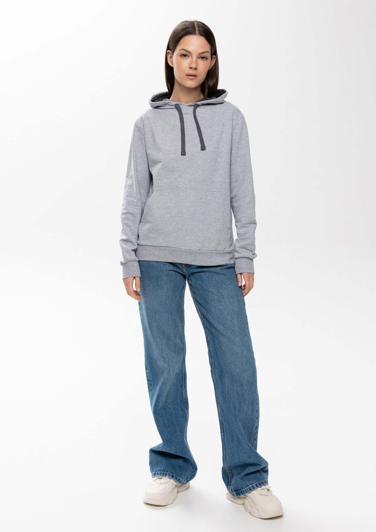 Толстовка прямого силуэта с капюшоном, втачным рукавом и карманом-кенгуру. Капюшон дополнен шнурком для регулирования прилегания, манжет и низ изделия оформлены широкой эластичной резинкой. Возможно два варианта исполнения: контрастные шнурок и бейка/шнурок и бейка в цвет толстовки.